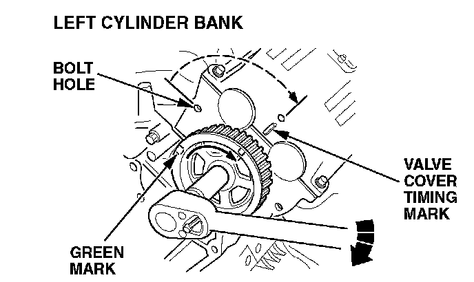 3. Turn the left cylinder bank's camshaft pulley clockwise with a socket and ratchet. (The pulley clicks and stops several times.) Stop the pulley when its green mark aligns with the timing belt cover bolt hole.