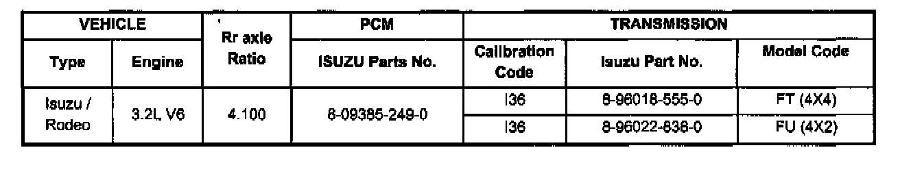 The chart contains a list of all important information concerning rear axle ratio, Powertrain Control Module (PCM), and transmission identification.