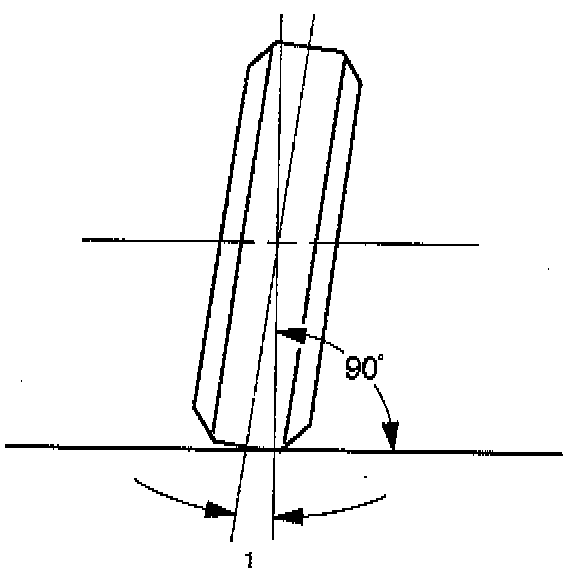 This illustration shows view from the side of the vehicle. Caster (1) is the vertical tilting of the wheel axis either forward or backward (when viewed from the side of the vehicle). A backward tilt is positive (+) and a forward tilt is negative (-). On the short and long arm type suspension you cannot see a caster angle without a special instrument, but if you look straight down from the top of the upper control arm to the ground, the ball joints do not line up (fore and aft) when a caster angle other than 0 degree is present. With a positive angle, the lower ball joint would be slightly ahead (toward the front of the vehicle) of the upper ball joint center line.
