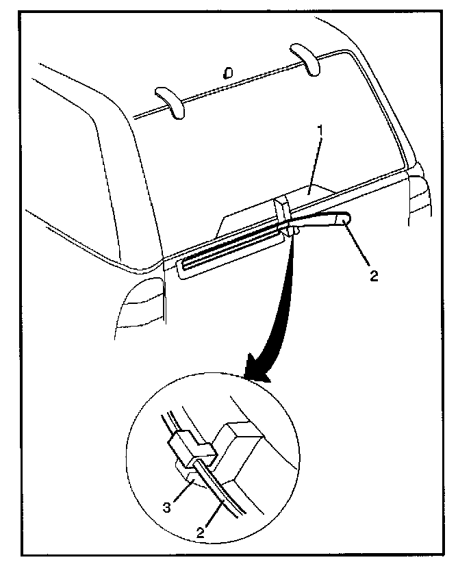 2. Install the wiper arm/blade so that the wiper arm (2) contact with the stopper portion (3) on the hatch gate cover (1) as shown in the figure.