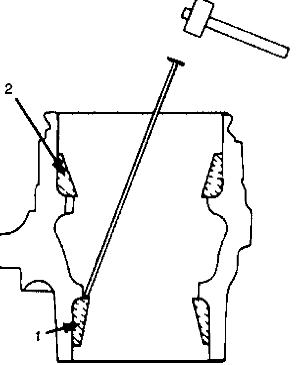 10. Use a brass bar to remove the outer bearing outer race (1), oil seal, inner bearing and inner bearing outer race (2) front the hub.