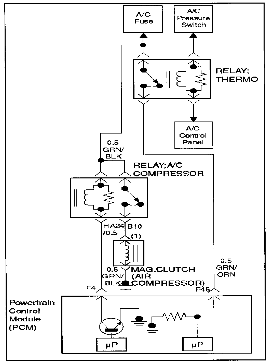 When air conditioning and blower fan are selected, and if the system has a sufficient refrigerant charge, a 12-volt signal is supplied to the A/C request input of the powertrain Control module (PCM). The A/C request signal may be temporarily canceled during system operation by the electronic thermostat in the evaporator case. When the A/C request signal is received by the PCM, the PCM supplies a ground from the compressor clutch relay if the engine operating conditions are within acceptable ranges. With the A/C compressor relay energized, voltage is supplied to the compressor clutch coil.