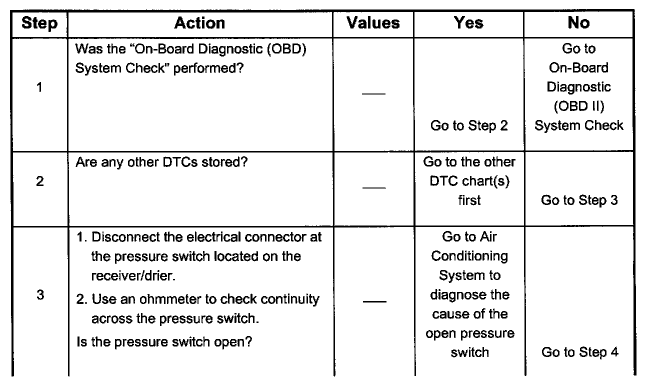 3. This a test determine is the problem is with the refrigerant system. If the switch is open, A/C pressure gauges will be used to determine if the pressure switch is faulty or if the system is partially discharged or empty.