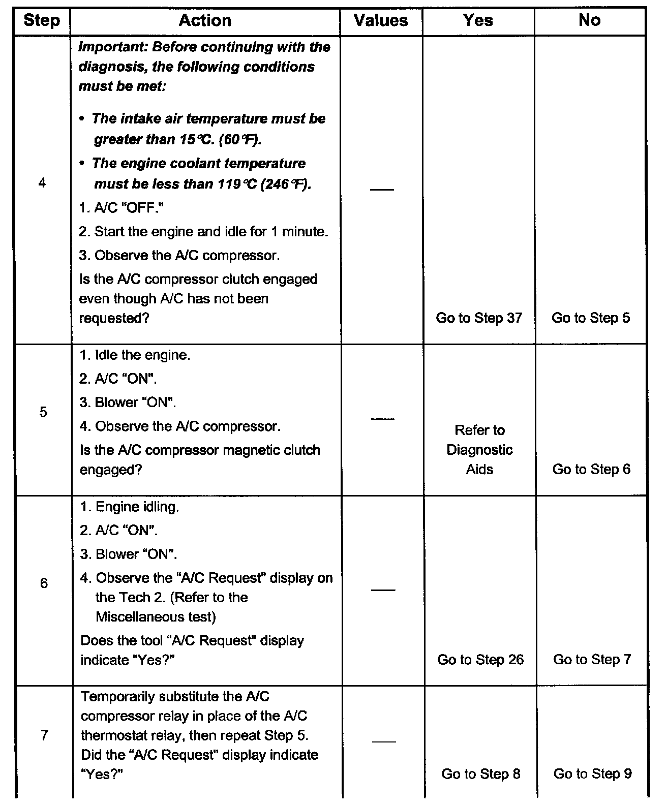 This chart should be used for diagnosing the electrical portion of the A/C compressor clutch circuit. A Tech 2 will be used in diagnosing the system. The Tech 2 has the ability to read the A/C request input to the PCM. The Tech 2 can display when the PCM has commanded the A/C clutch "ON." The Tech 2 should have the ability to override the A/C request signal and energize the A/C compressor relay.