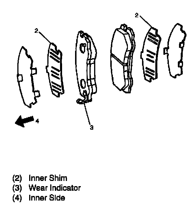 NOTE: If a squealing noise occurs from the front brake while driving, check the pad wear indicator plate. If the indicator plate contacts the rotor, the disc pad assembly should be replaced.