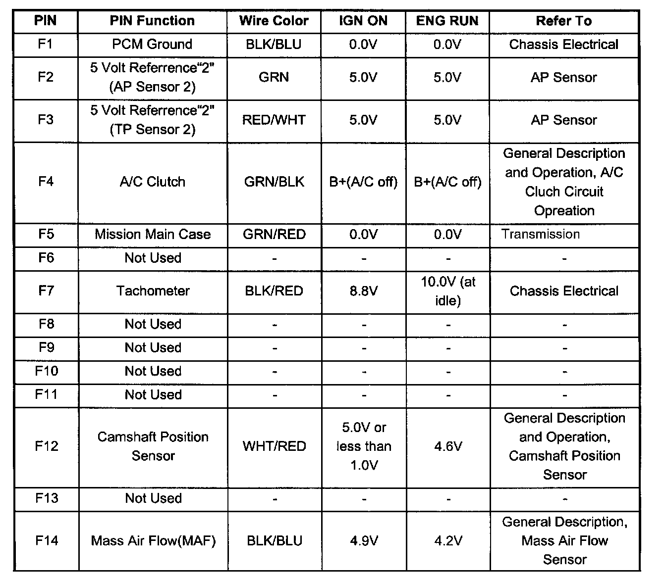 PCM Pinout Table, 80 - Way Blue Connector - Row "F1 - 20" (F1 To F14):