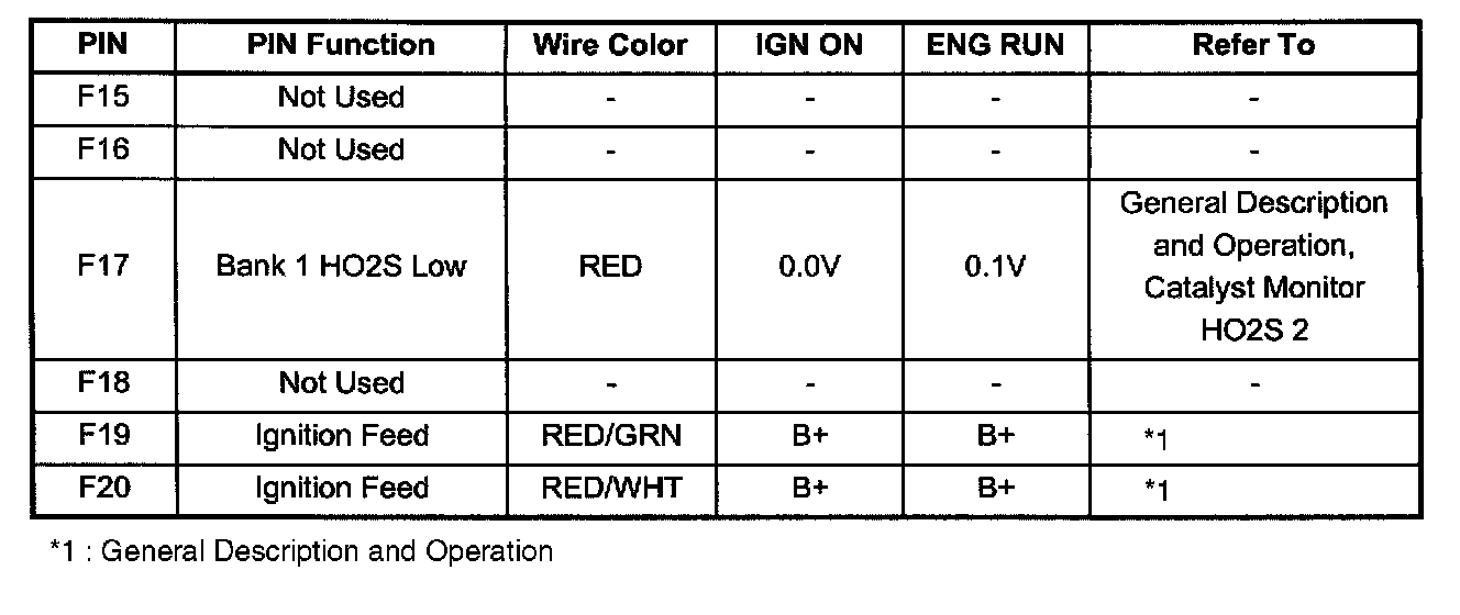 PCM Pinout Table, 80 - Way Blue Connector - Row "F1 - 20" (F15 To F20):