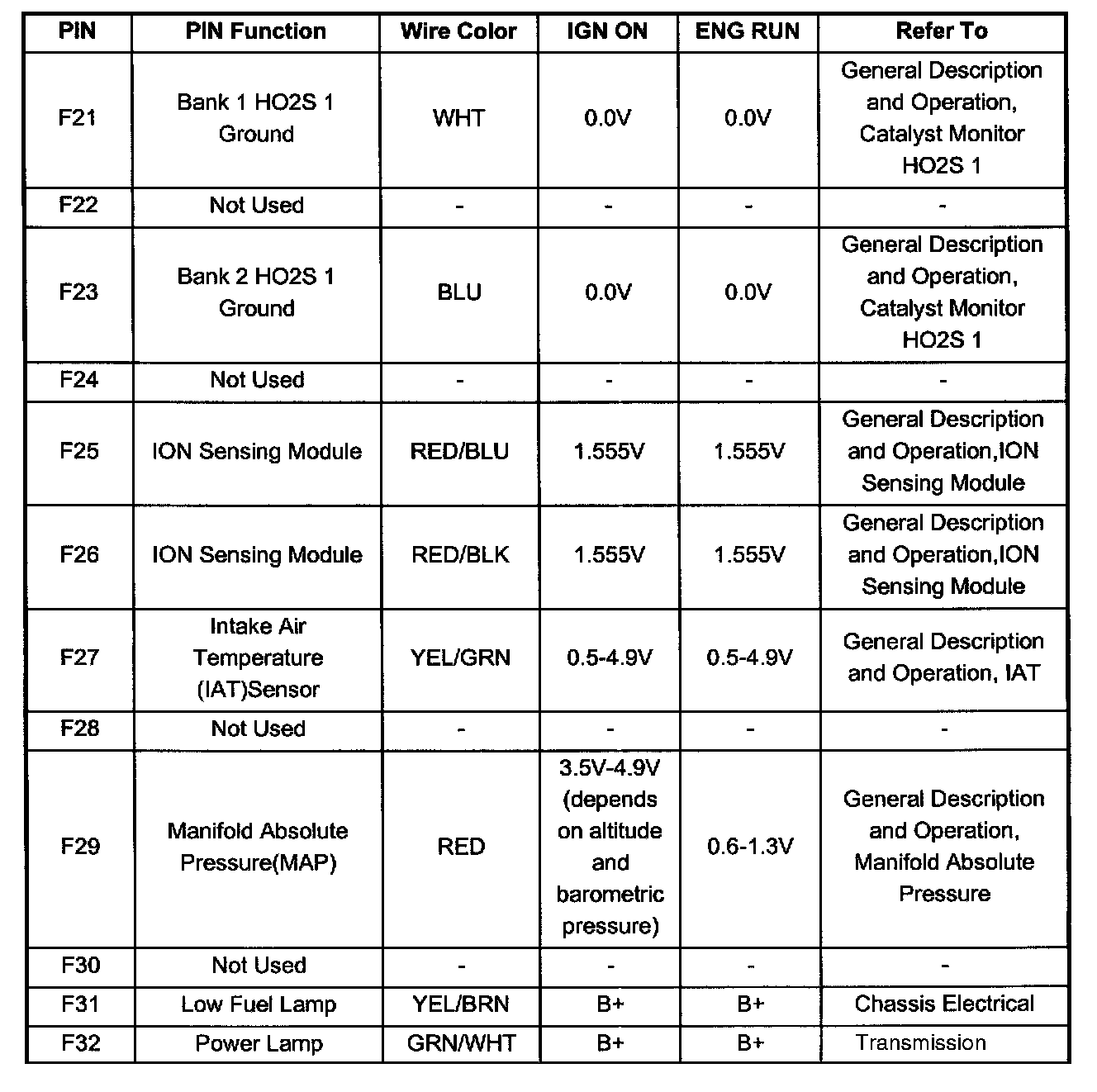 PCM Pinout Table, 80 - Way Blue Connector - Row "F20 - 40" (F21 To F32):