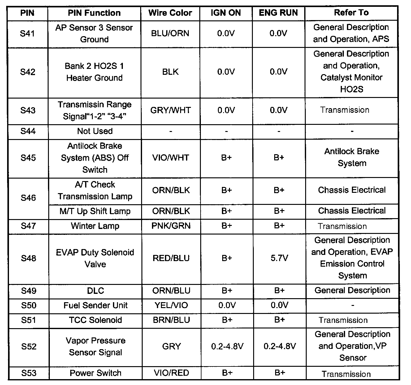 PCM Pinout Table, 80 - Way Red Connector - Row "S41 - 60" (S41 To S53):