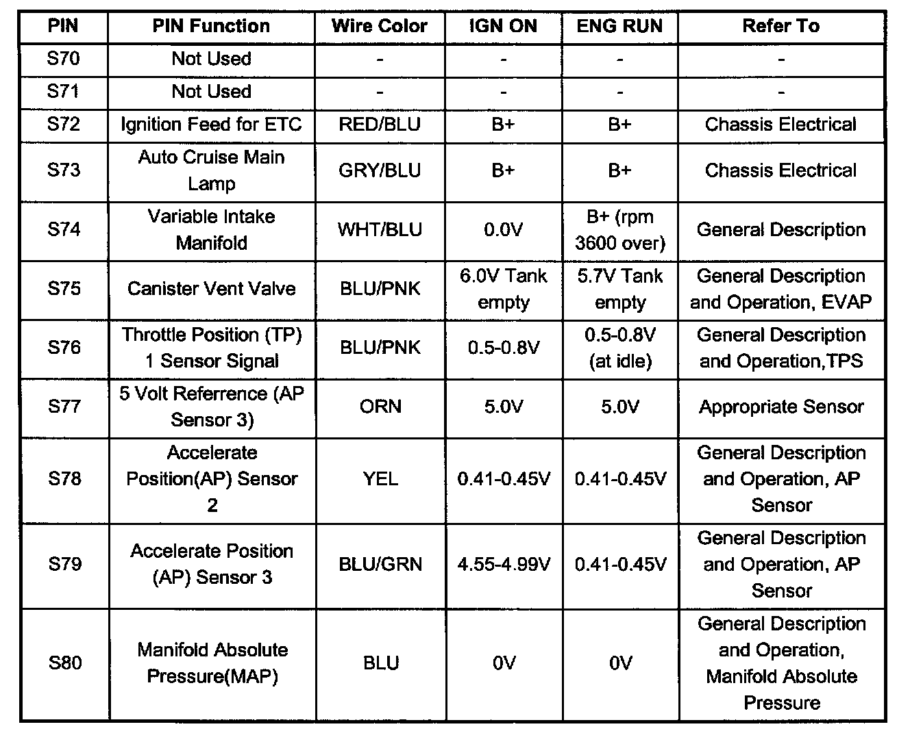PCM Pinout Table, 80 - Way Red Connector - Row "S61 - 80" (S70 To S80):