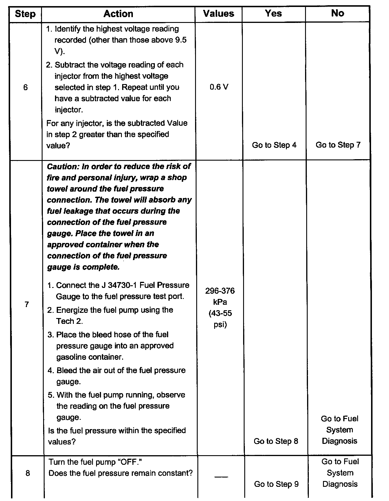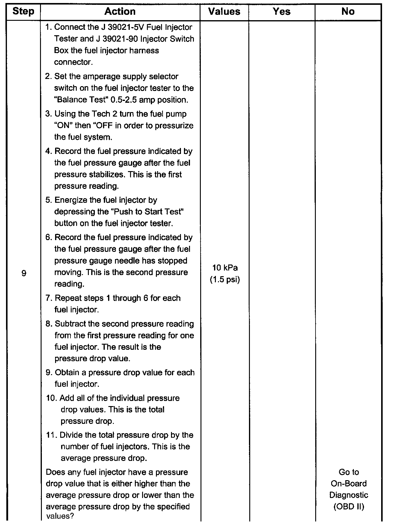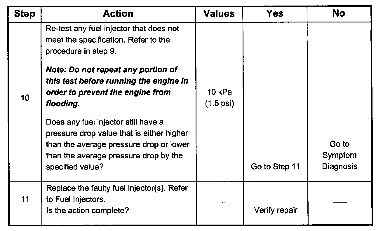 7. The Fuel Injector Balance Test portion of this chart (Step 7 through Step 11) checks the mechanical (fuel delivery) portion of the fuel injector. An engine cool-down period of 10 minutes is necessary in order to avoid irregular fuel pressure readings due to "Hot Soak" fuel boiling.