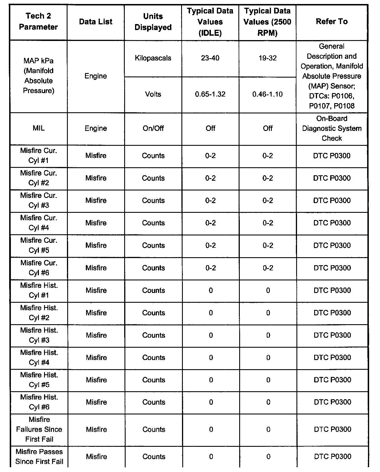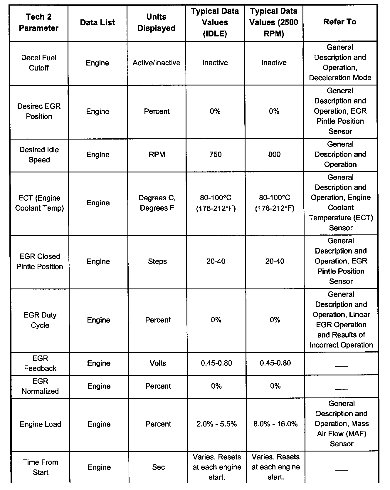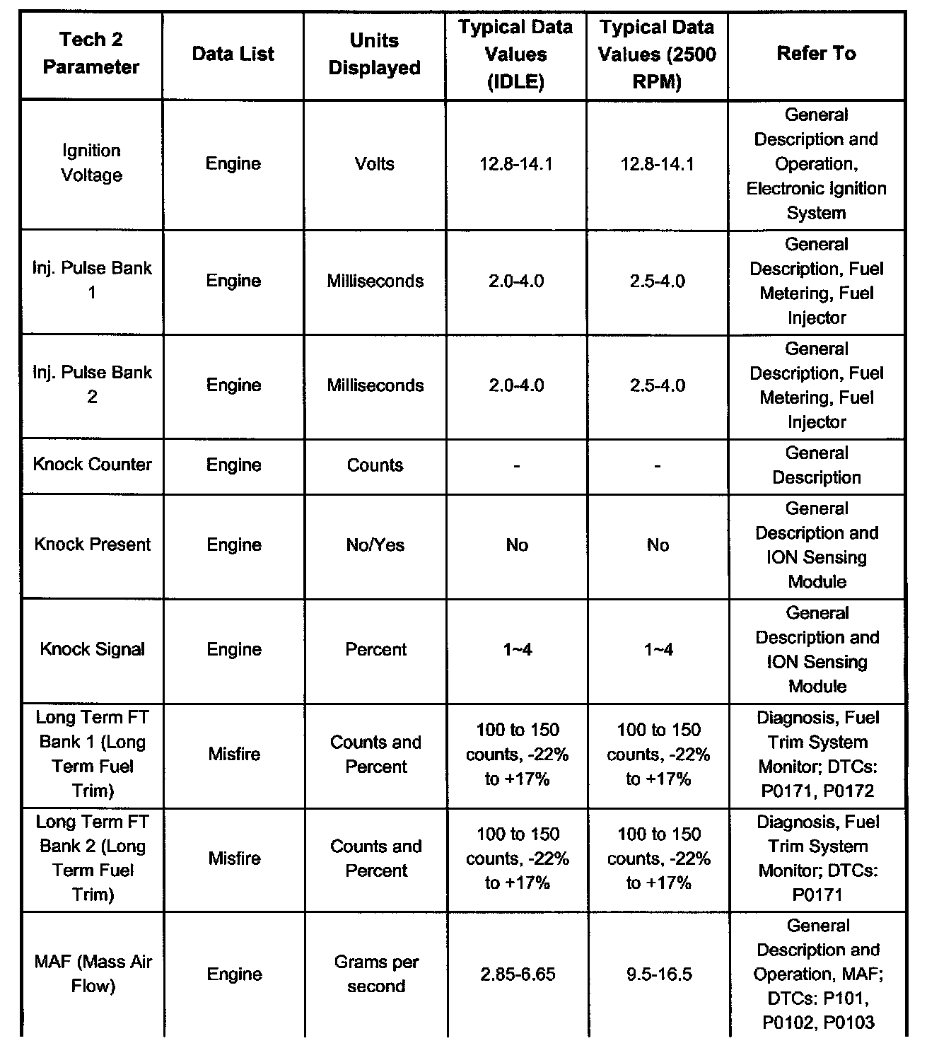 Only the parameters listed are referred for use in diagnosis. For further information on using the Tech 2 to diagnose the PCM and related sensors, refer to the applicable reference listed below. If all values are within the typical range described below, refer to Symptom Diagnosis for diagnosis.