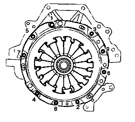 11. Install pressure plate assembly and tighten the bolts holding the pressure plate assembly in the order shown in illustration.