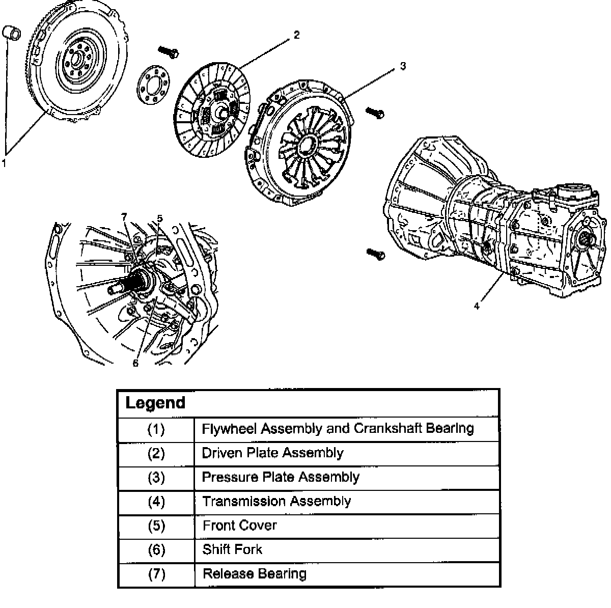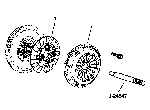 3. Remove driven plate assembly (1), use the pilot aligner J-24547 to prevent the driven plate assembly (1) from falling free.