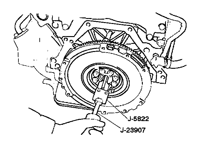 11. Use the remover J-5822 and sliding hammer J-23907 to remove the crankshaft bearing