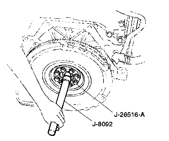 1. Install flywheel assembly and crankshaft bearing, use the installer J-26516-A and driver handle J-8092 to install the crankshaft bearing then clean and lubricate with grease.
