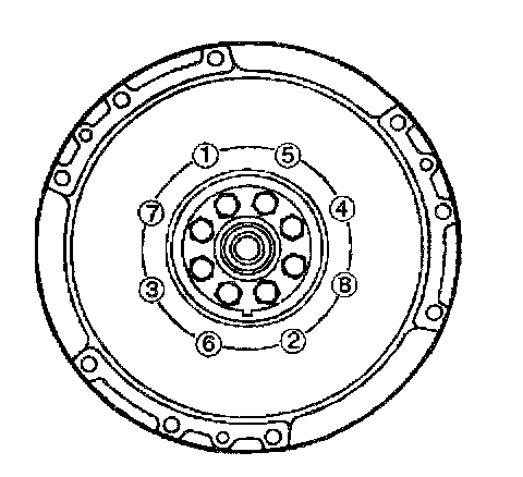 2. Install new flywheel fixing bolts in the order illustrated and tighten them to the specified torque.