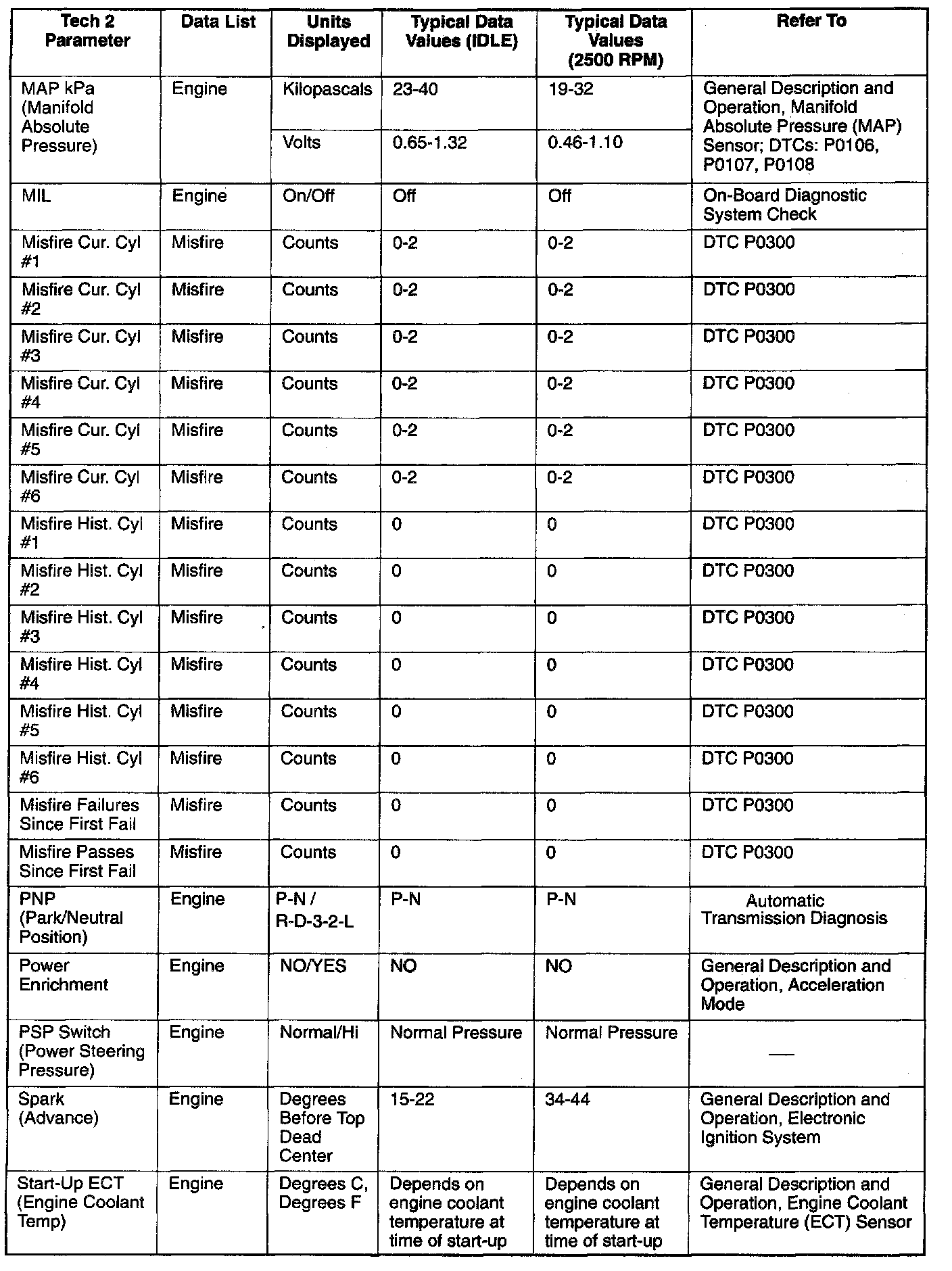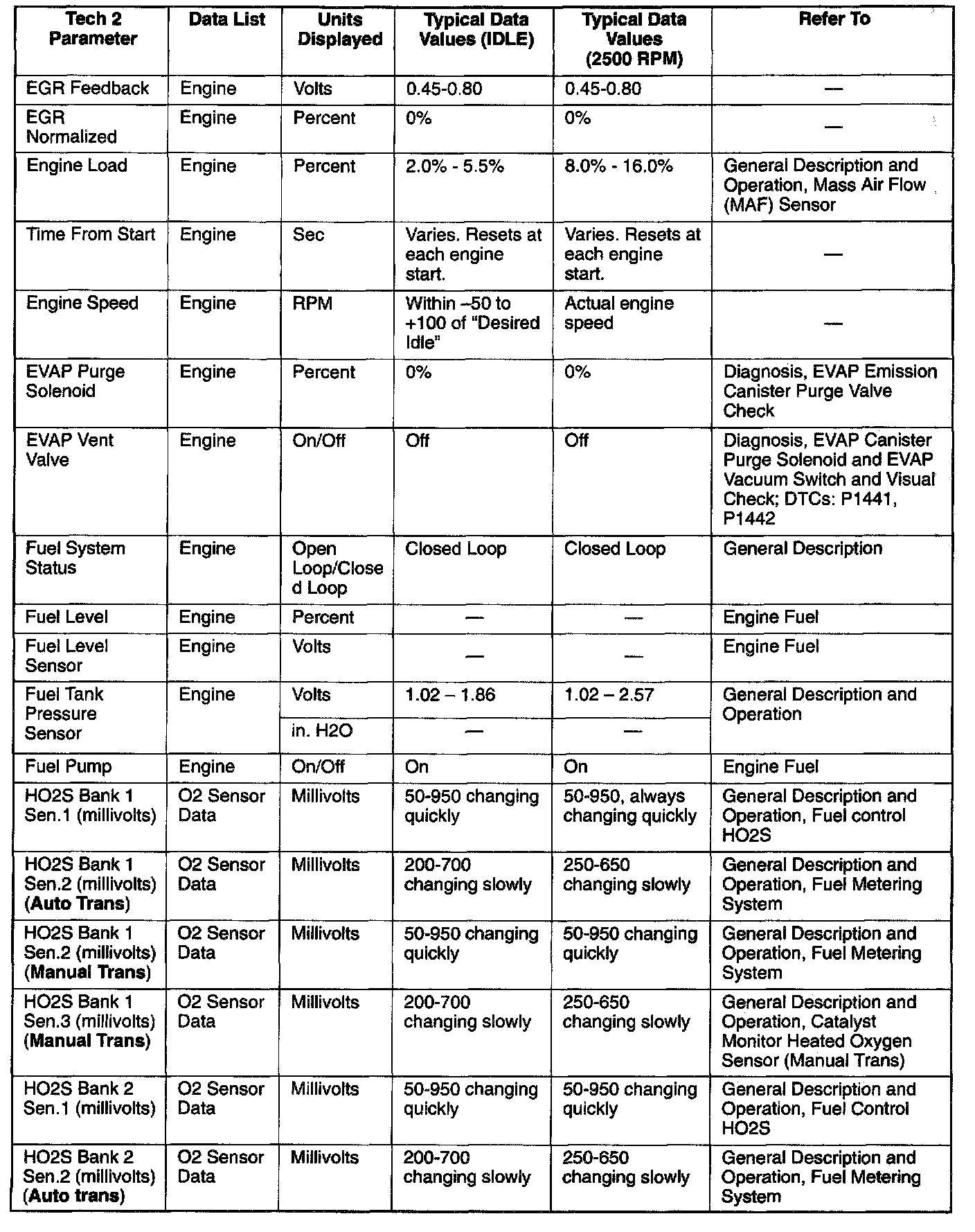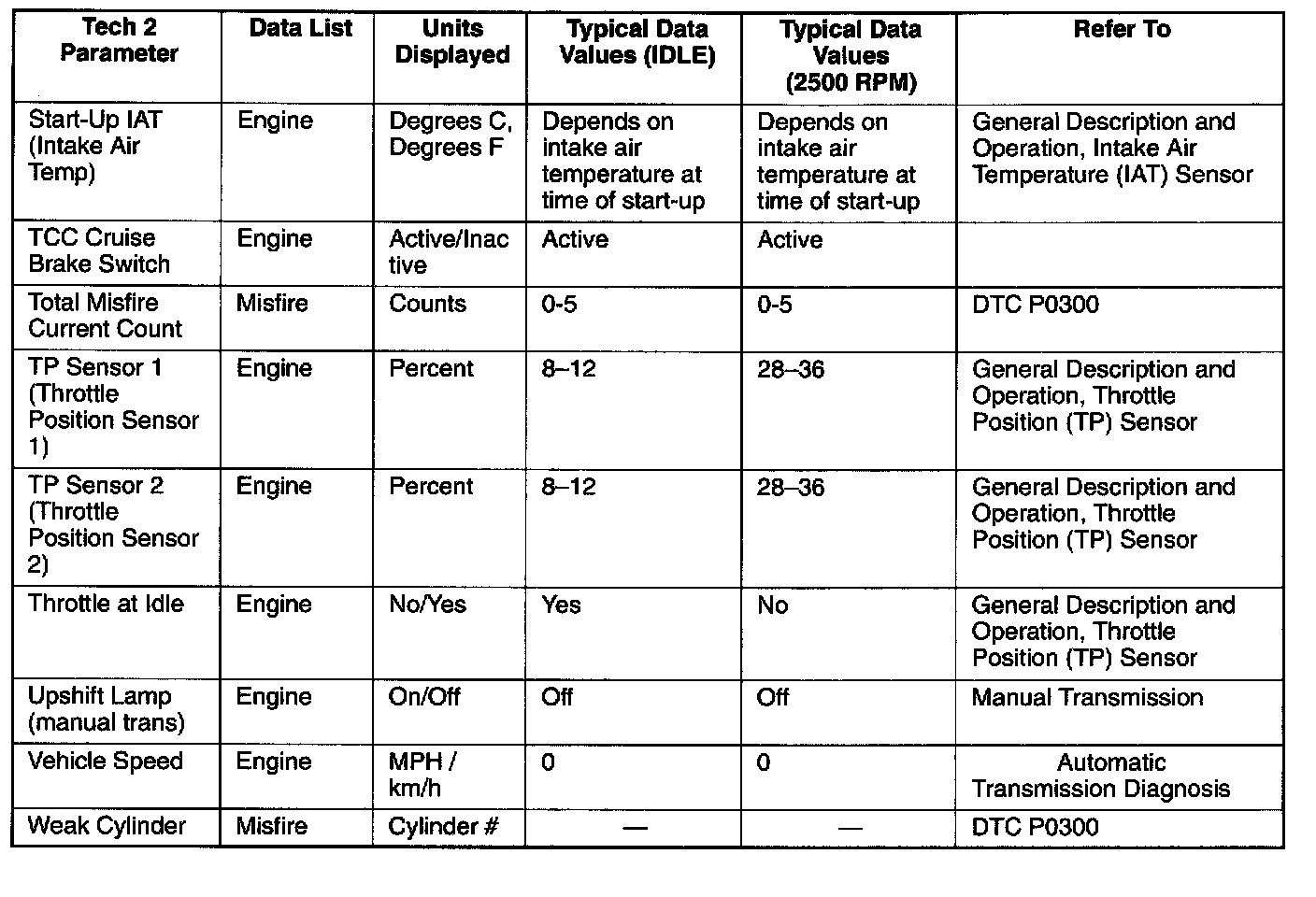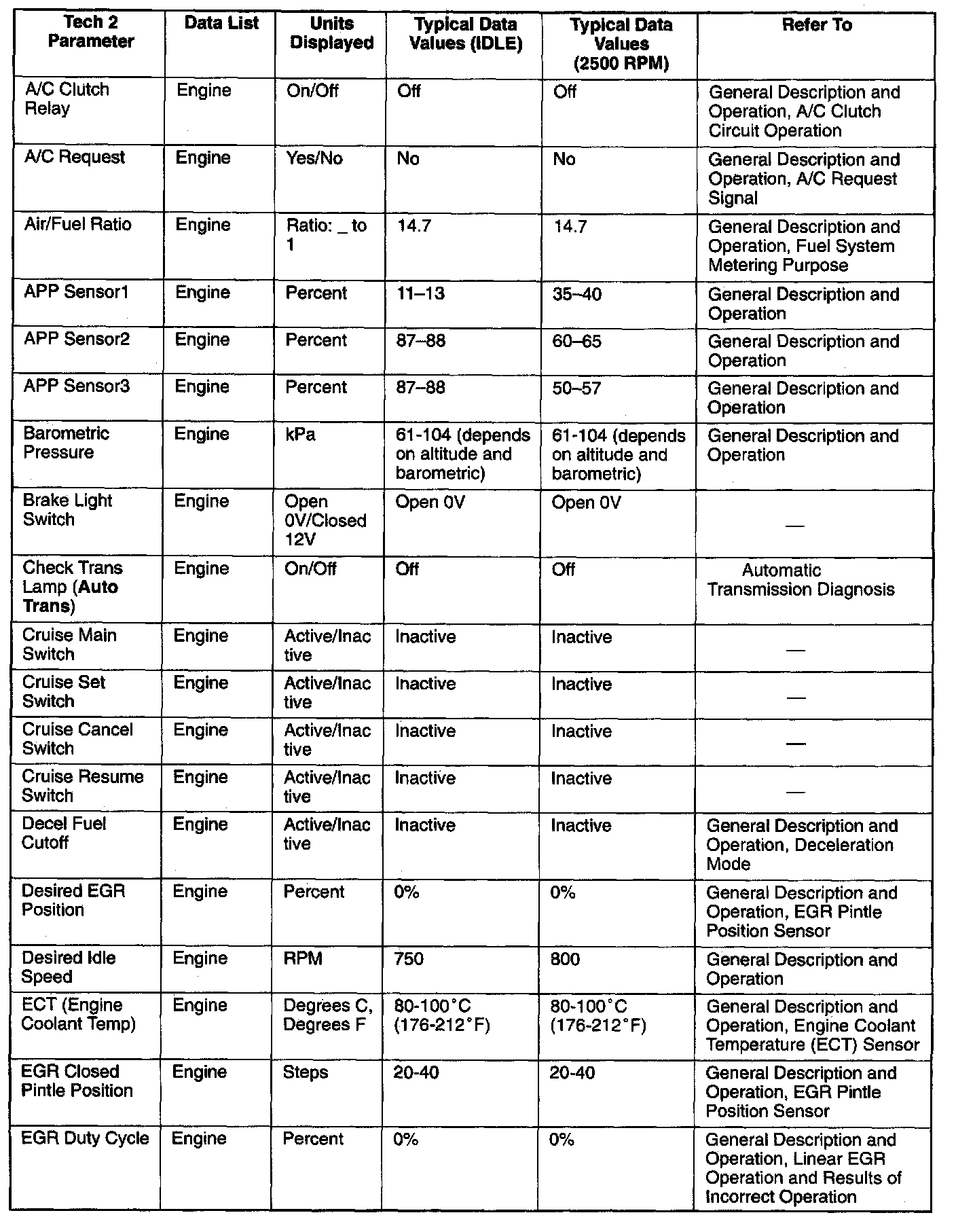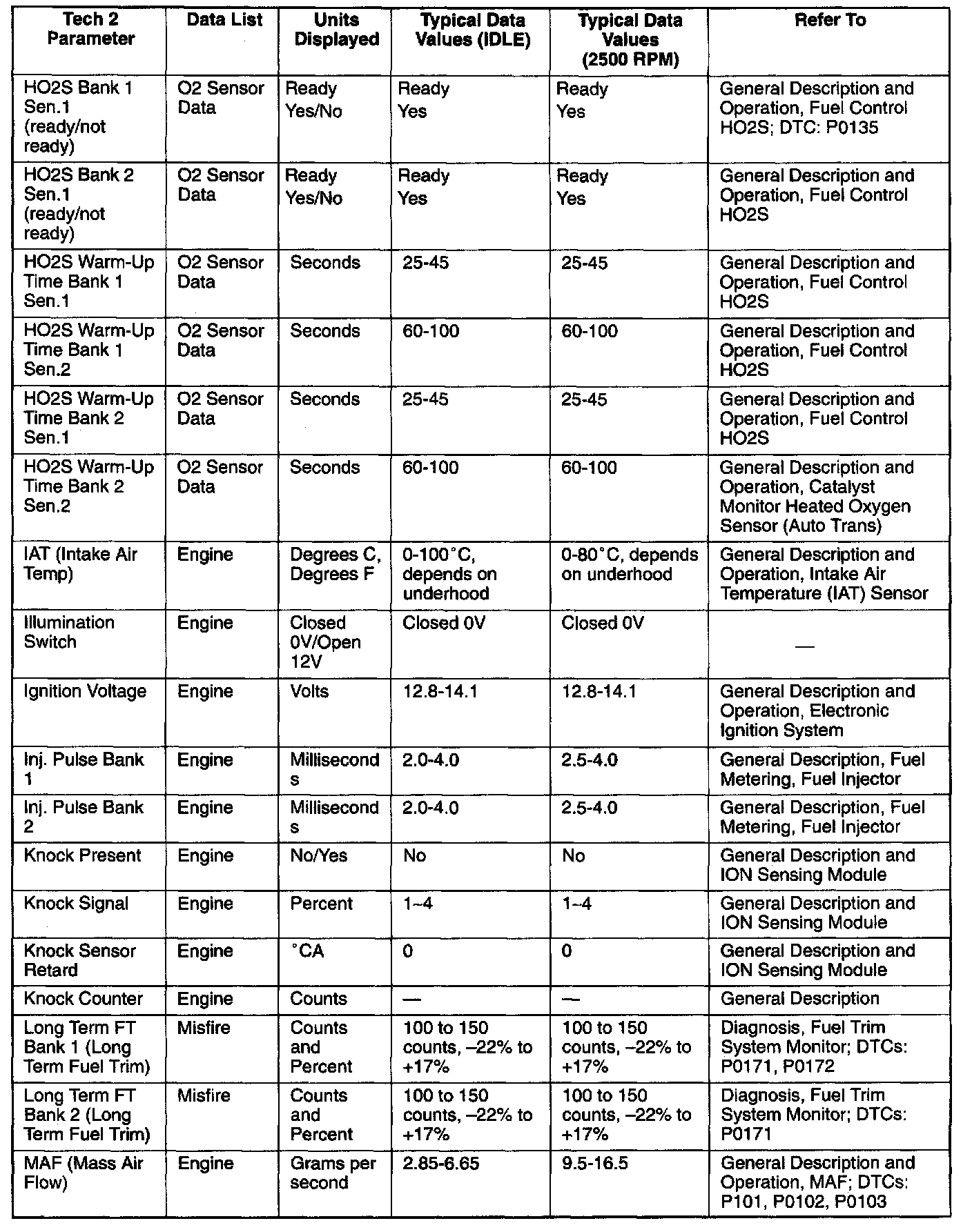 Only the parameters listed below are referred to in this service manual for use in diagnosis. For further information on using the Tech 2 to diagnose the PCM and related sensors, refer to the applicable reference section listed below. If all values are within the typical range described below, refer to the Diagnosis By Symptom.