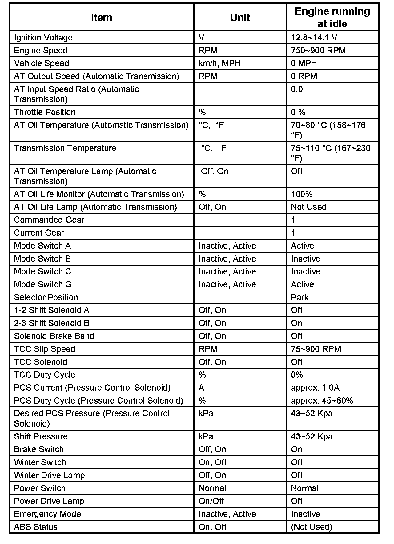 Preconditions: P-N position, idle engine speed, no vehicle speed