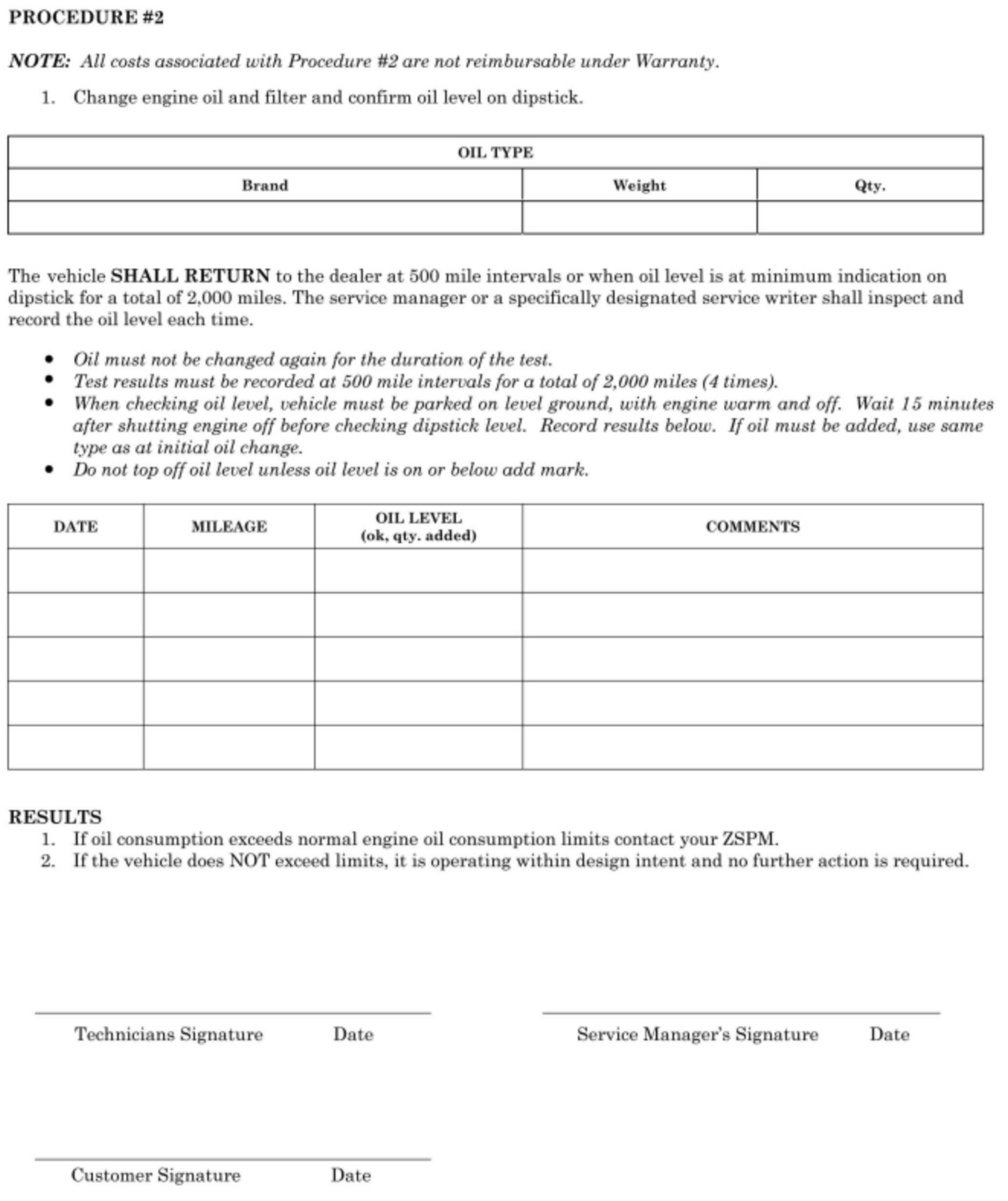 Before performing any warranty repairs, based on a customer's complaint of excessive engine oil consumption, the attached Engine Oil Usage Test/Report must be completed in full.