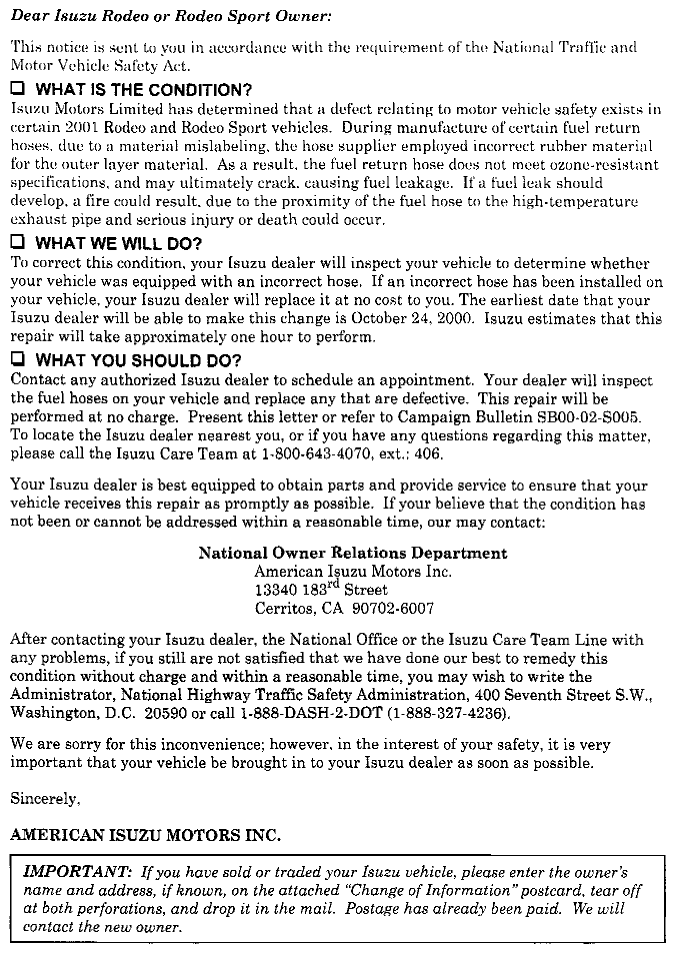 American Isuzu Motors Inc. (AIMI) will send a notification letter to owners of affected vehicles already retailed (See Included Copy). Dealers should follow up with vehicle owners by sending a Campaign Reminder Notice (AIMI SVCF-1052) to all vehicle owners listed in the AIMI Campaign Report AWS 123-1A. Dealers may obtain these postcards from their Regional Office.