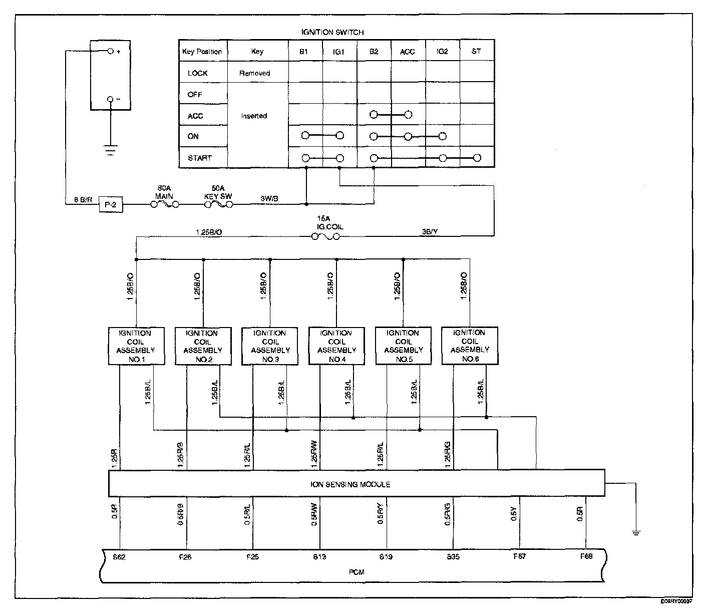 The EI consists of six ignition coils,ignition control module, crank position sensor, powertrain control module (PCM) and other components.
