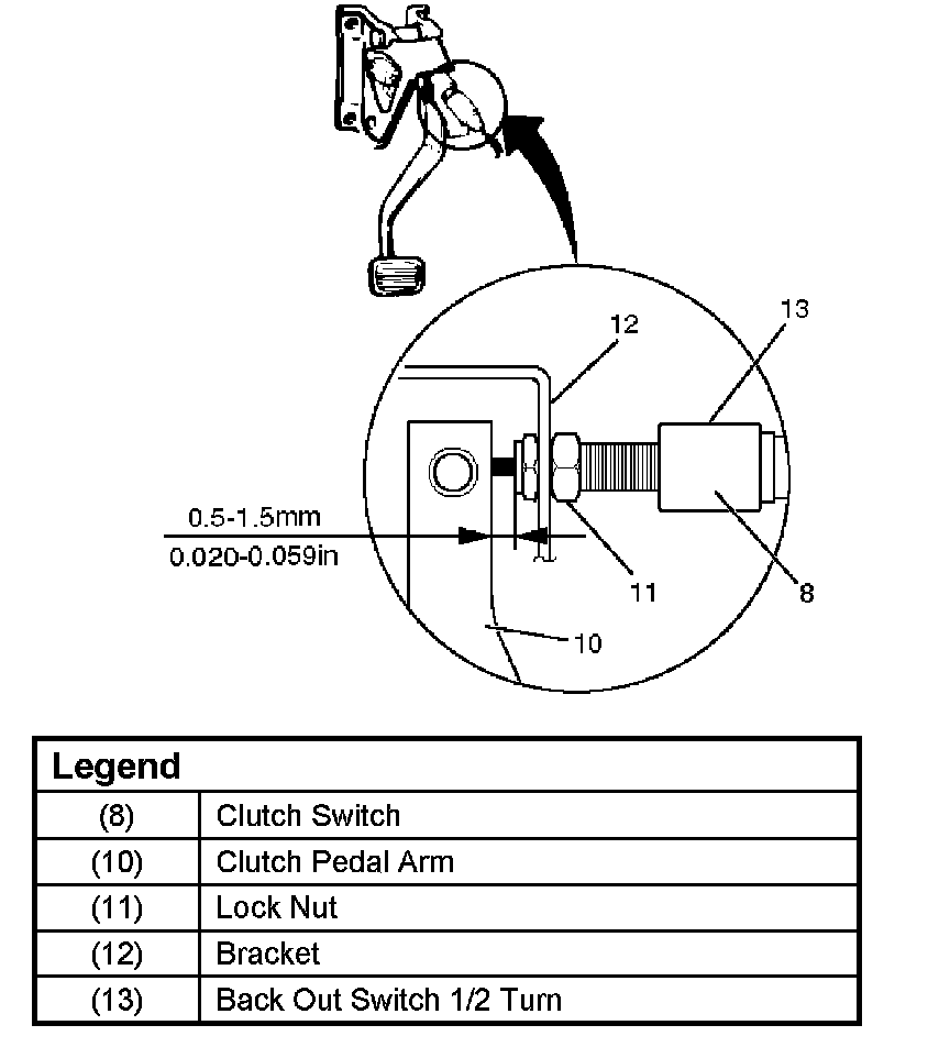 Clutch Switch and Clutch Pedal Clearance 0.5 - 1.5 mm (0.020 - 0.059 inch)
