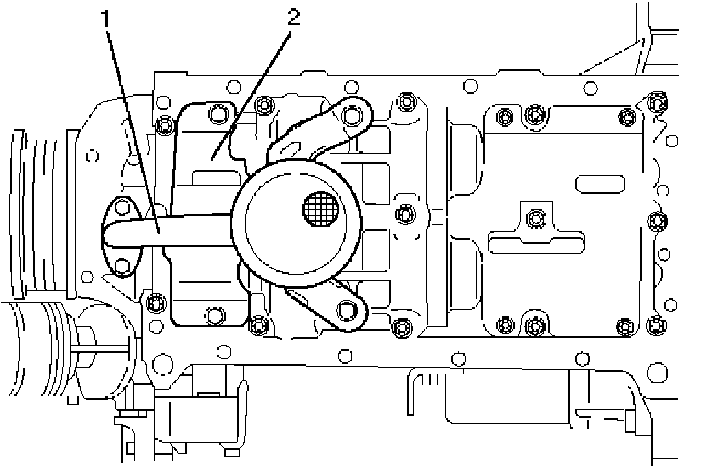 3. Remove the oil strainer (1) from oil pump and the oil baffle plate (2).