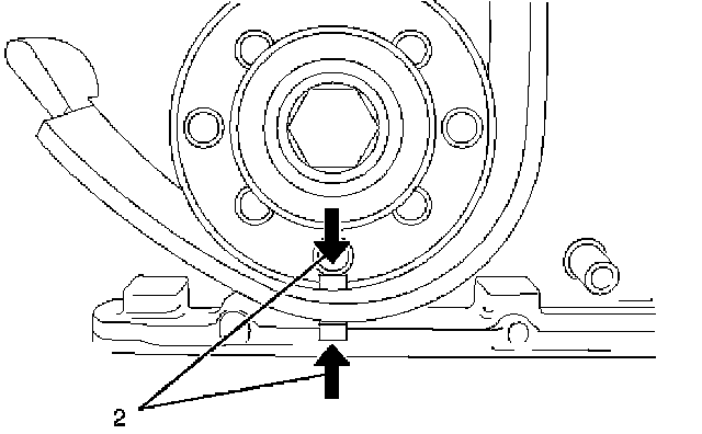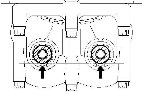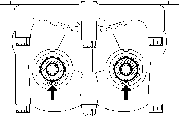 2. In this crankshaft position, the flattened side (arrows) of both balancer shafts must face downward and must be on a horizontal line.