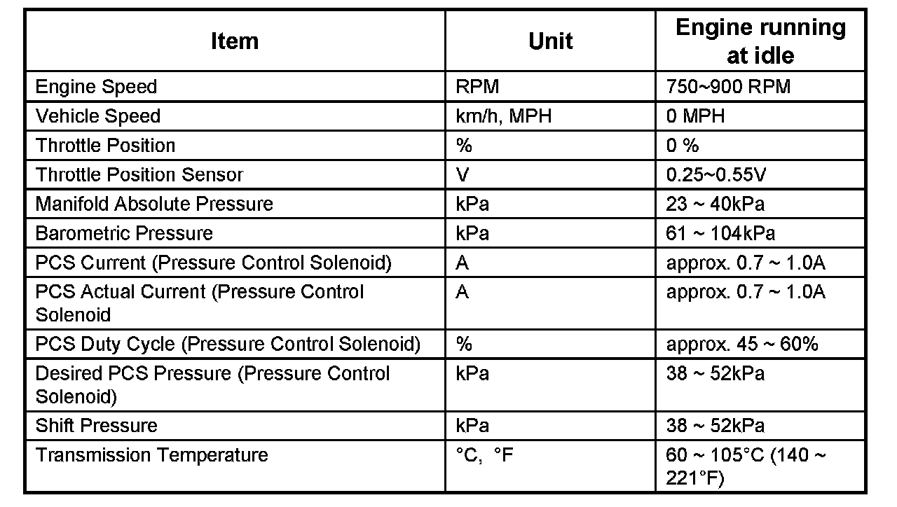 You can set desired PCS Current using the "Increment" and "Decrement" button and it operates between 0.0 A and 1.0 A. The PC Solenoid Data informs about PCS Current, Pressure and Duty Cycle.