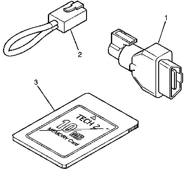 2. SAE 16/19 Pin Adapter (3000098)(1), RS232 Loop Back Connector (3000112)(2), and PCMCIA Card (3000117)(3).