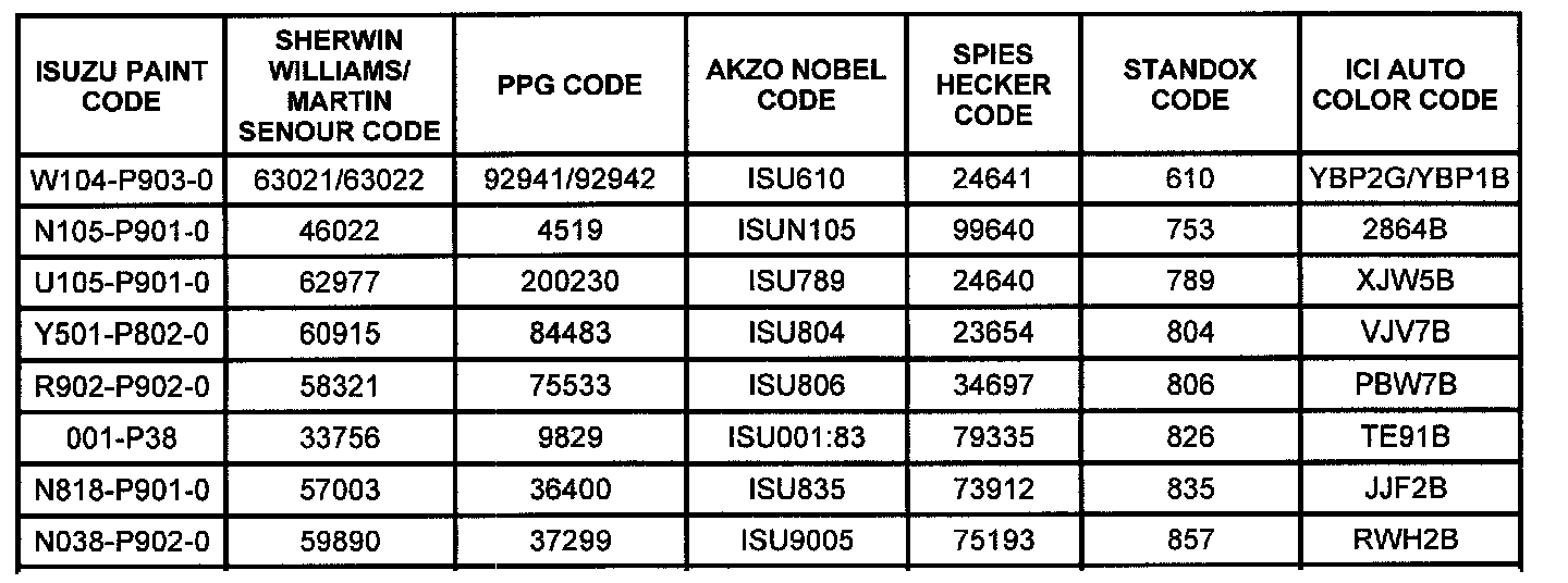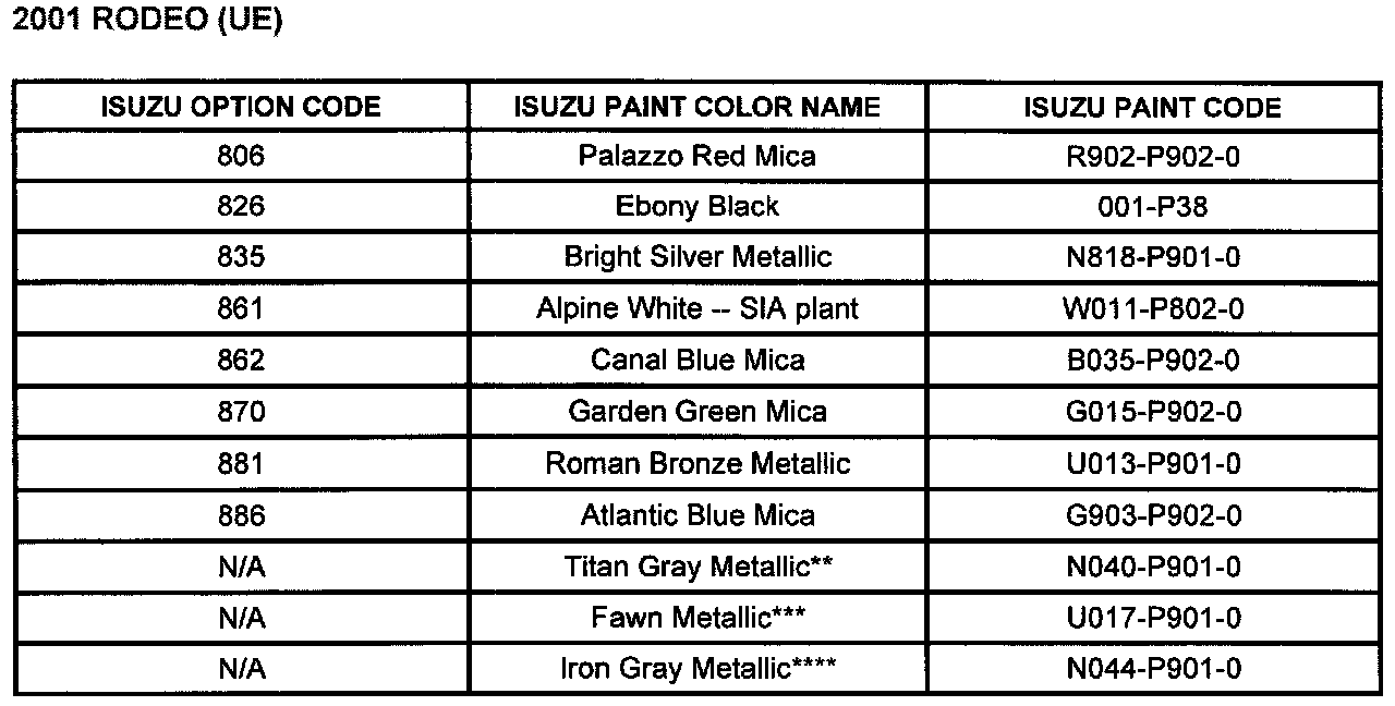 **Trim color for Rodeo and Rodeo Sport Bumper Fascias and available overfenders. Also, trim color for all Rodeo Sport Ironman appearance package (bumpers, moldings, and hybrid tire cover).