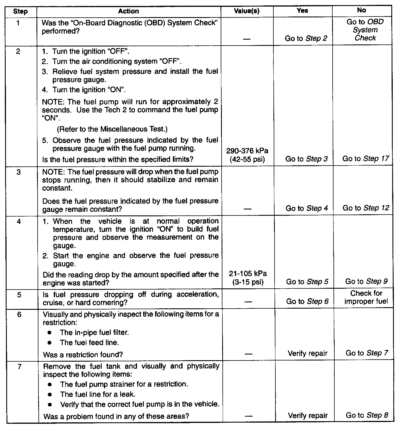 4. Fuel pressure that drops off during acceleration, cruise, or hard cornering may case a lean condition. A lean condition can cause a loss of power, surging, or misfire. A lean condition can be diagnosed using a Tech 2. If an extremely lean condition occurs, the oxygen sensor(s) will stop toggling. The oxygen sensor output voltage(s) will drop below 500 mV. Also, the fuel injector pulse width will increase.