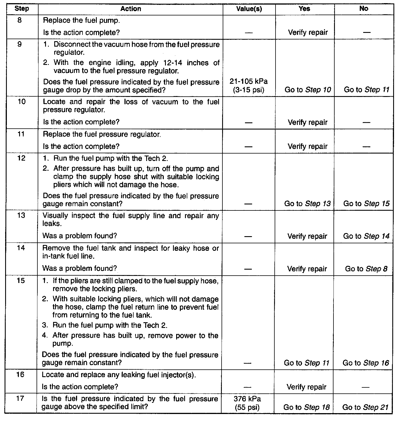 22. Restricting the fuel return line causes the fuel pressure to rise above the regulated fuel pressure. Command the fuel pump "ON" with the Tech 2. The fuel pressure should rise above 376 kPa (55 psi) as the fuel return line becomes partially closed.