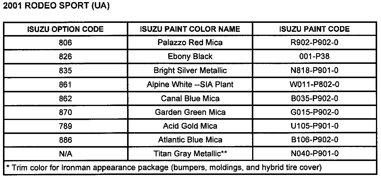 **Trim color for Rodeo and Rodeo Sport Bumper Fascias and available overfenders. Also, trim color for all Rodeo Sport Ironman appearance package (bumpers, moldings, and hybrid tire cover).