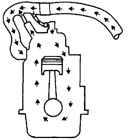 While the engine is running, exhaust gases and small amounts of the fuel/air mixture escape past the piston rings and enter the crankcase. These gases are mixed with clean air entering through a tube from the air intake duct.