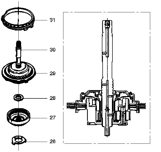 30. Preassemble overdrive internal gear (27) and thrust bearing assembly (28) onto the turbine shaft and overrun clutch assembly.