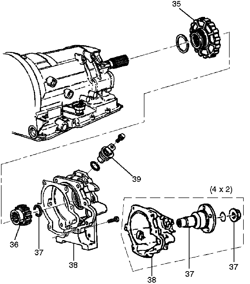 34. Insert two converter housing/main case screws to hold adapter case while pulling out fourth clutch piston (38).