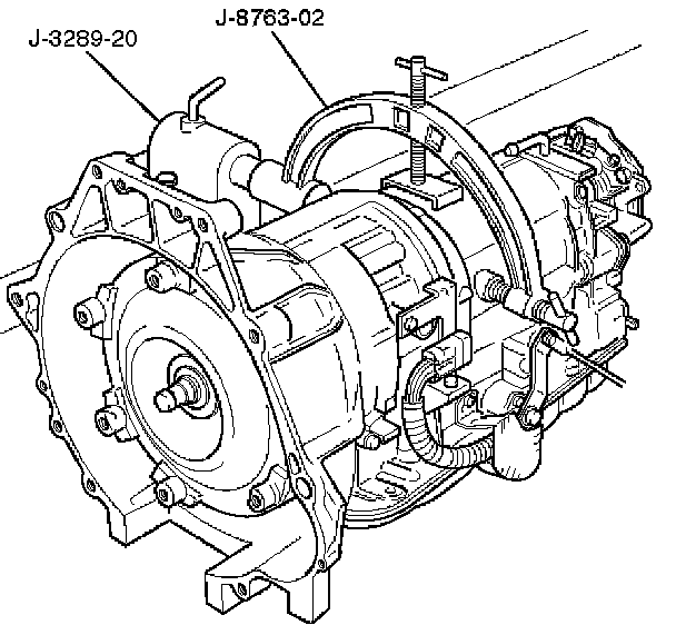 ^ Attach J-8763-02 holding fixture to the transmission and set it on J-3289-20 holding fixture base.