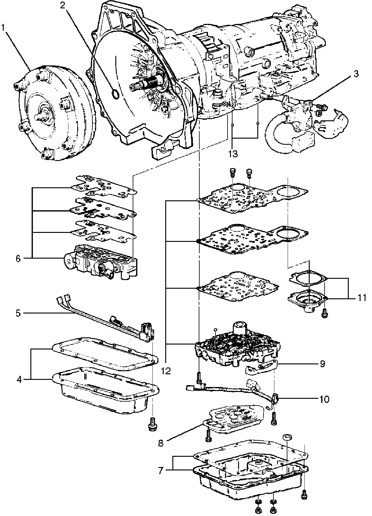 ^ Remove main valve body assembly (12) with manual valve link and transfer plate. Note the position of the link (long end into valve, short end into range selector lever).