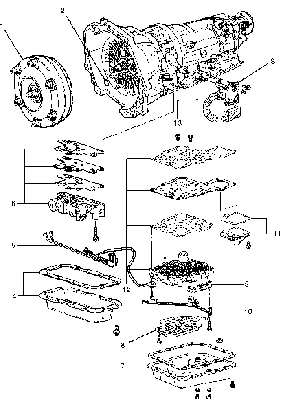 ^ Loosen the converter housing and oil pump assembly fixing screws, but do not remove, the five 13 mm inner screws unless oil pump disassembly is required.