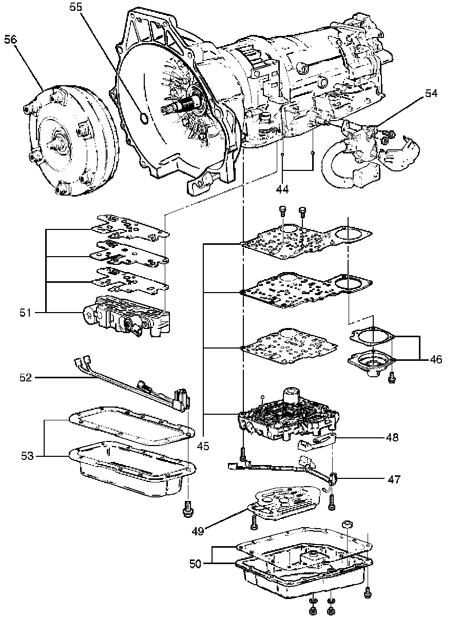 56. Connect wiring harness harness assembly (52) to converter clutch solenoid, force motor, and 4 way (V6) or 5 way (HEC) connector.