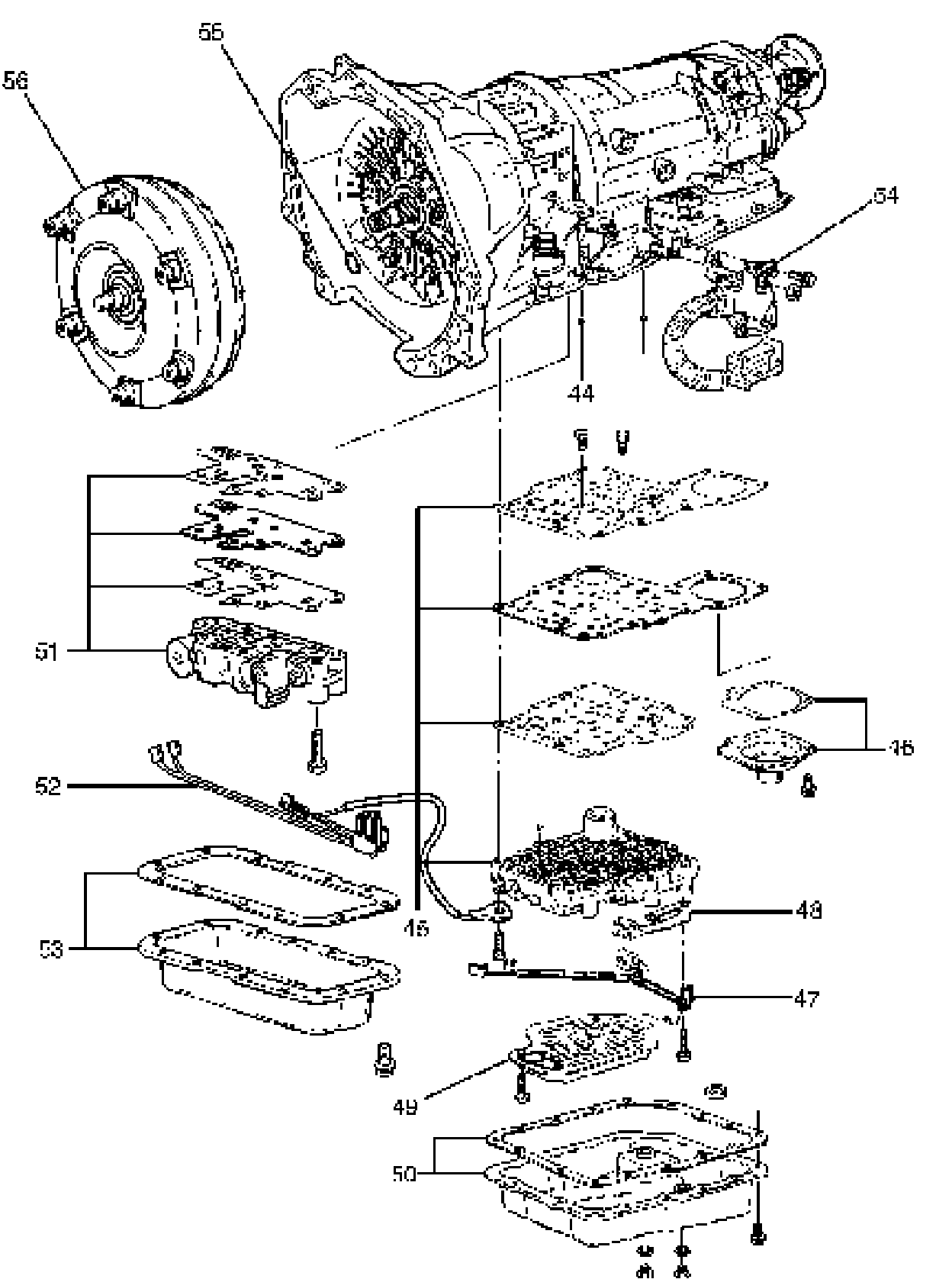 49. Remove parking lock and range selector lever (56), and actuator assembly.