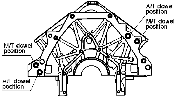 NOTE: Take care that dowel positions are different between the manual transmission and the automatic transmission.