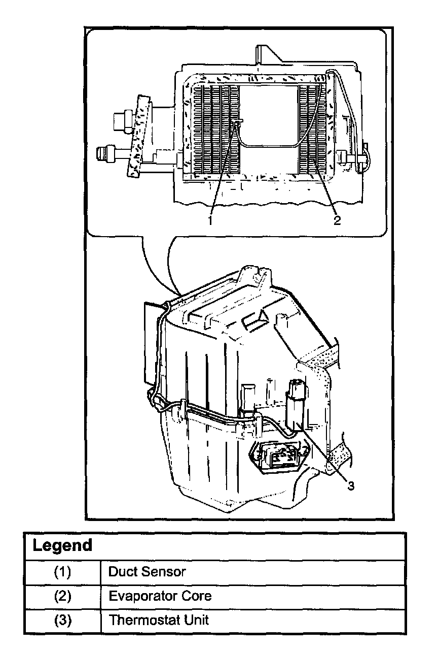 The electronic duct sensor is mounted at the evaporator core outlet and senses the surface temperature of the evaporator core. Temperature signals are input to the thermostat unit. This information is compared by the thermo unit and results in the output to operate the A/C thermostat relay and turn the magnetic clutch ON or OFF to prevent evaporator freeze-up.