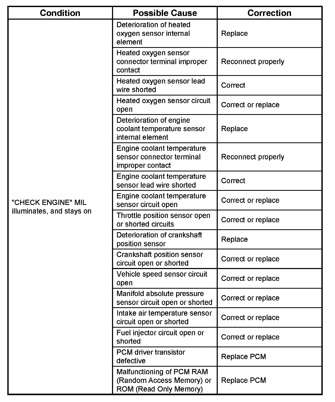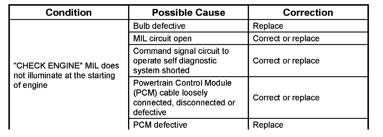 The instrument panel "CHECK ENGINE" Malfunction Indicator Lamp (MIL) illuminates by self diagnostic system when the system checks the starting of engine, or senses malfunctions.
