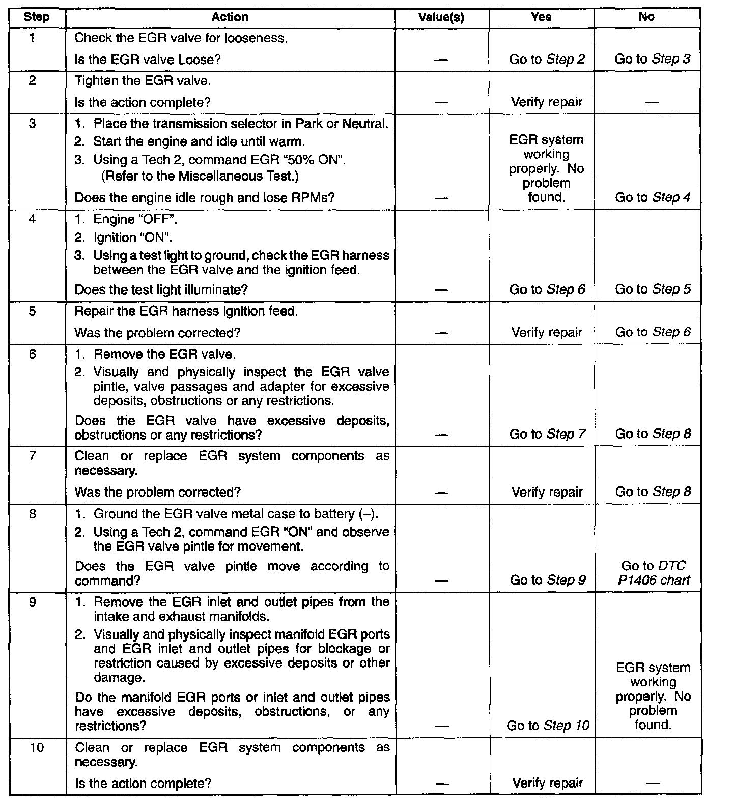 The EGR valve chart is a check of the EGR system. An EGR pintle constantly in the closed position could cause detonation and high emissions of NOx. It could also result in high long term fuel trim values in the open throttle cell, but not in the closed throttle cell. An EGR pintle constantly in the open position would cause a rough idle. Also, an EGR mounted incorrectly (rotated 180°) could cause rough idle. Check for the following items: