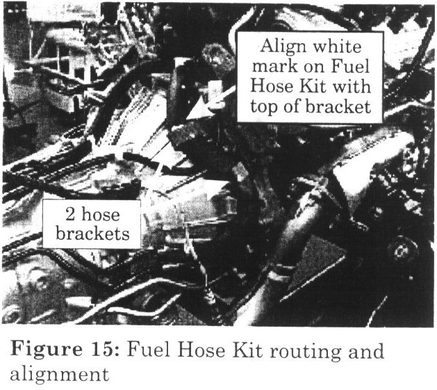 Verify Fuel Hose Kit Installation alignment. White mark on Fuel Hose Kit should be in alignment with the top of the metal retaining bracket (Figure 15).