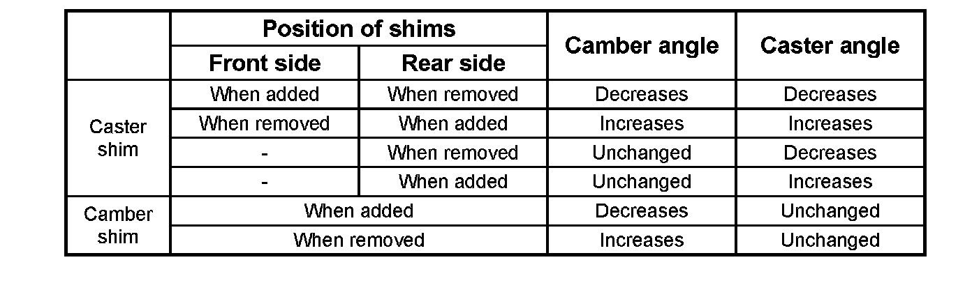 Note: Difference of the caster shim front/rear thickness should be 3.6 mm (0.142 inch) or less. Overall thickness of caster shim and camber shim should be 10.8 mm (0.425 inch) or less.