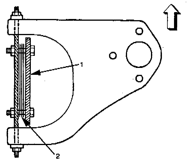The caster angle can be adjusted by means of the caster shims (1) installed between the chassis frame (2) and fulcrum pins.